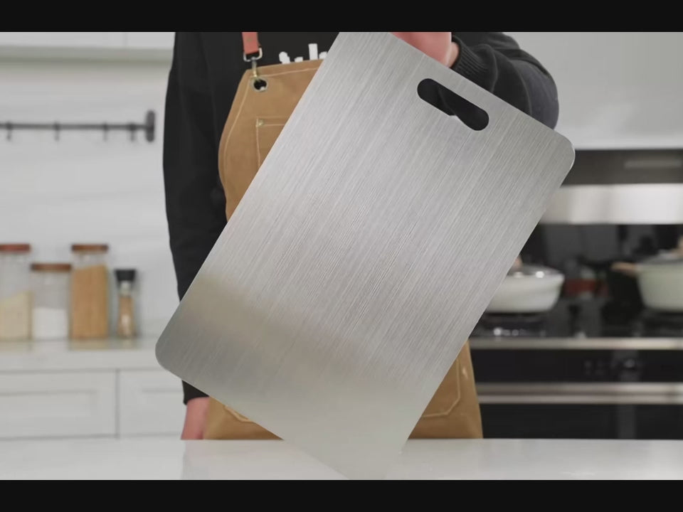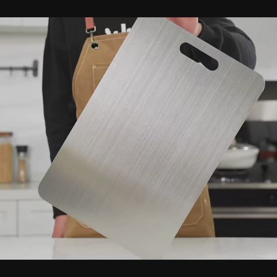 La plupart des couteaux de qualité ont une dureté Rockwell C (HRC) de 55 à 62, tandis que le titane, à environ 36 HRC, est plus tendre que l'acier tout en étant extrêmement résistant. Cet équilibre préserve le tranchant de vos couteaux, contrairement aux planches en verre ou en pierre, et permet de conserver lames et aliments en parfait état.